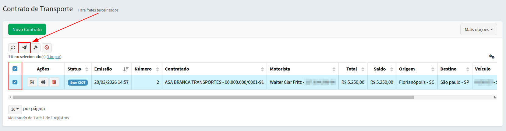Para fazer a emissão, selecione o CIOT na coluna e clique no ícone para fazer a emissão: