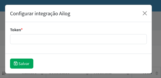 Vai abrir uma janela onde pode informar o Token de integração com a Ailog: