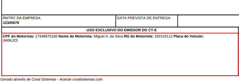 No rodapé do PDF no campo "USO EXCLUSIVO DO EMISSOR DO CT-E", vão aparecer os campos com os dados do veículo e motorista.