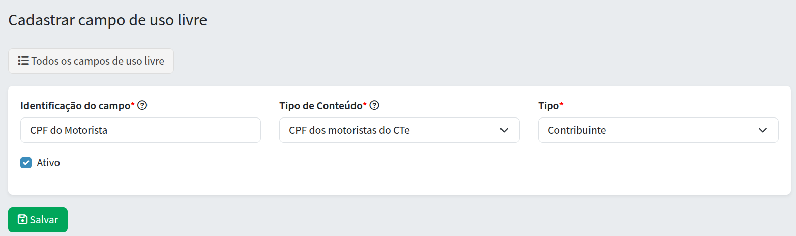 Nessa tela aparecerá os seus campos de uso livre cadastrados (campos que vão ser mostrados na impressão do DACTE).