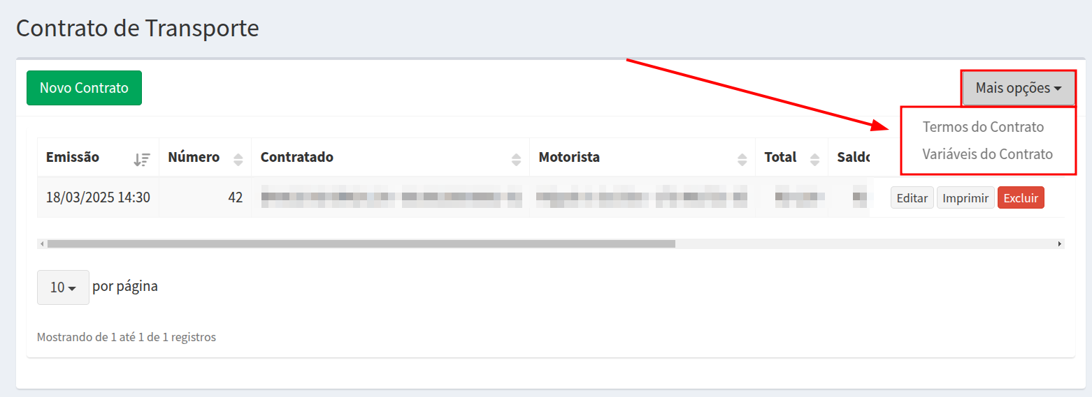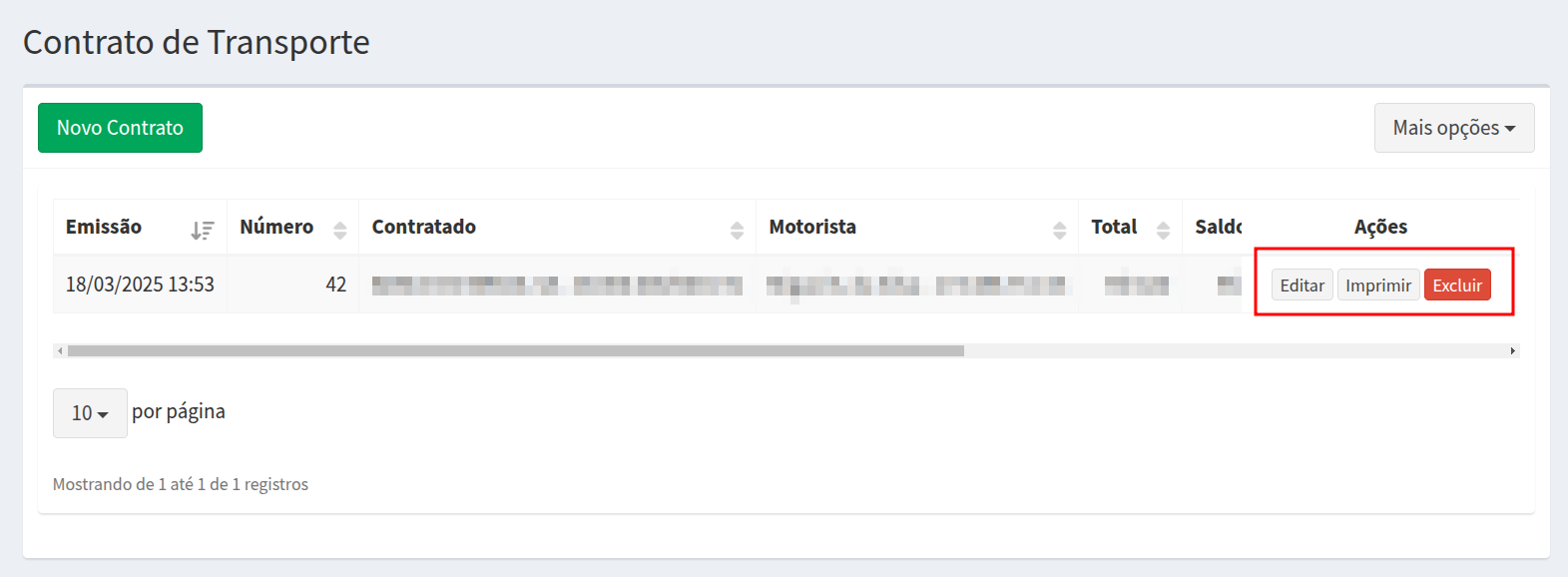 Depois de salvo, você verá uma lista com os seus Contratos de Transporte, onde pode editar, imprimir ou excluir, conforme mostra a imagem abaixo.