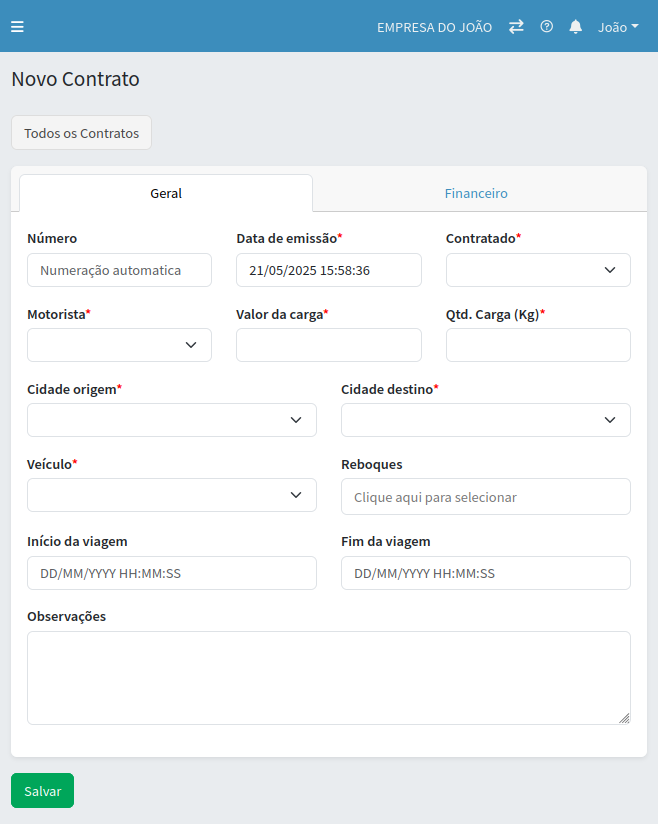 Passo 2: Depois de clicar em Novo Contrato, será apresentado todas as informações da interface do contrato de transporte que precisam ser preenchidas. Lembre-se que nem todos os campos são obrigatórios informar. Os campos obrigatórios estão destacados com um asterisco vermelho.