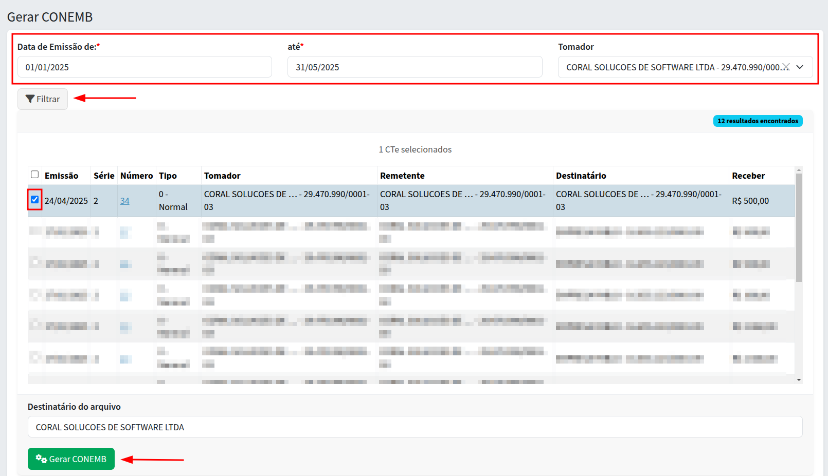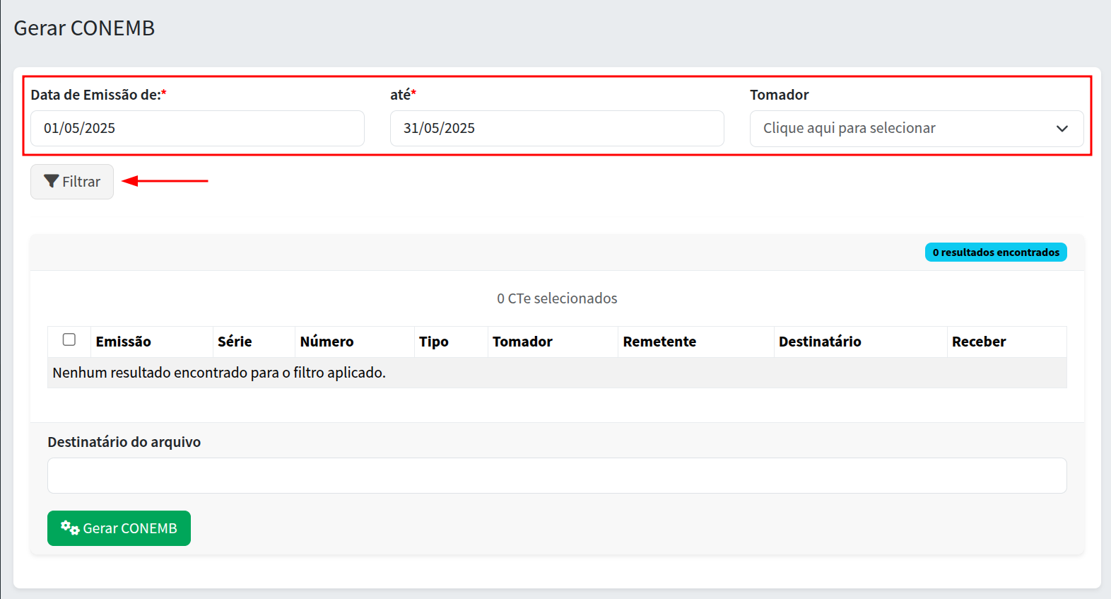 Após clicar em "Filtrar", o sistema exibirá os documentos emitidos. Selecione o documento que deseja gerar o CONEMB e clique em "Gerar CONEMB".