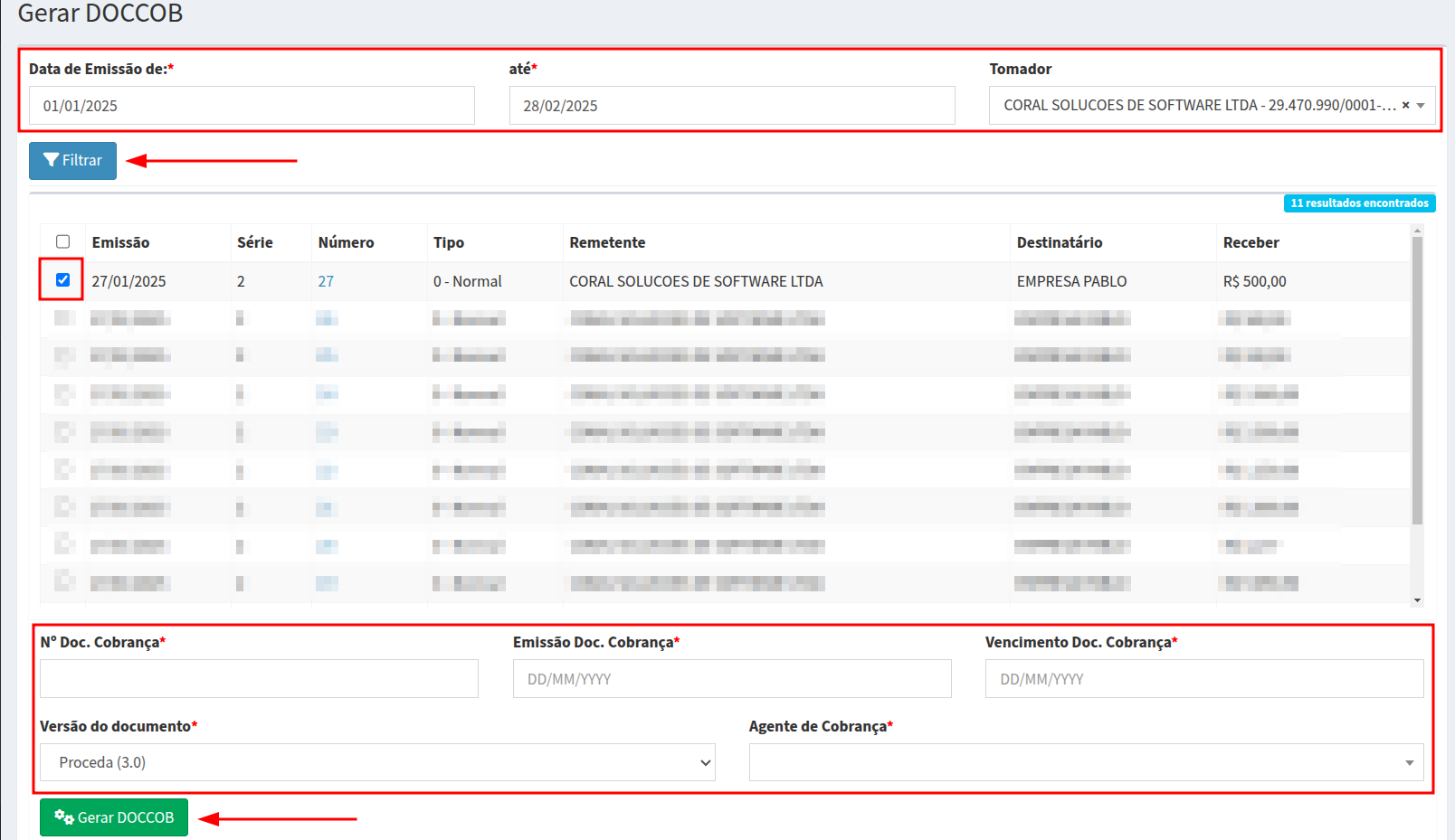 - Emissão Doc. Cobrança: Selecione a data de emissão do DOCCOB.