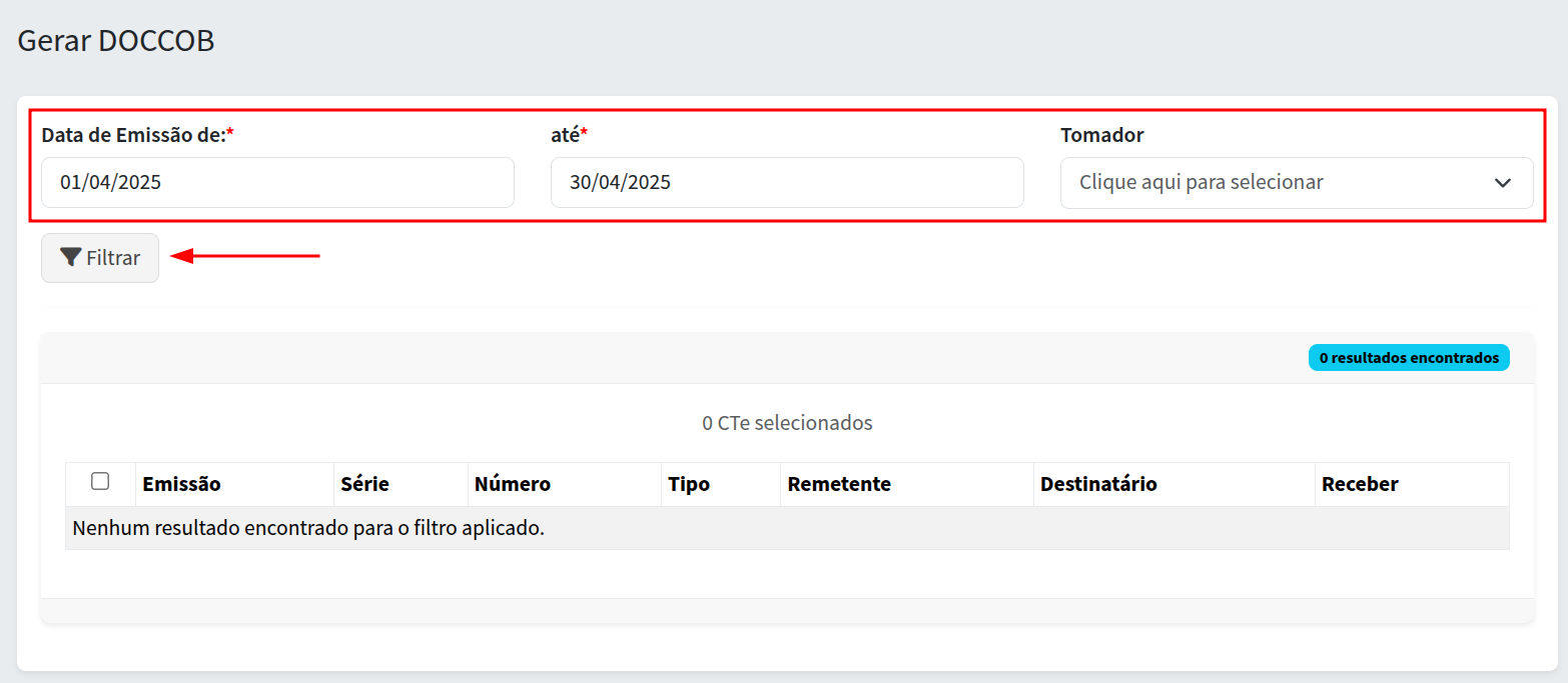 Tomador: Selecione um tomador para exibir apenas os documentos emitidos para ele.