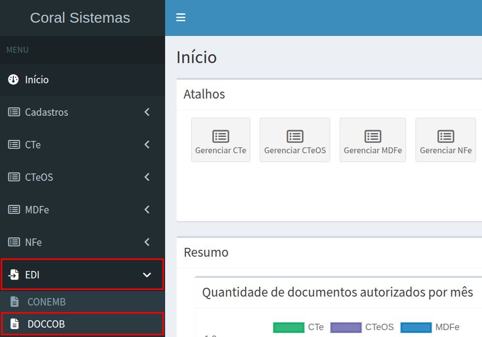 Em seguida, no menu lateral, será exibido uma guia com o nome de EDI. Clique sobre ela e verá que o CONEMB e o DOCCOB já estão na lista.