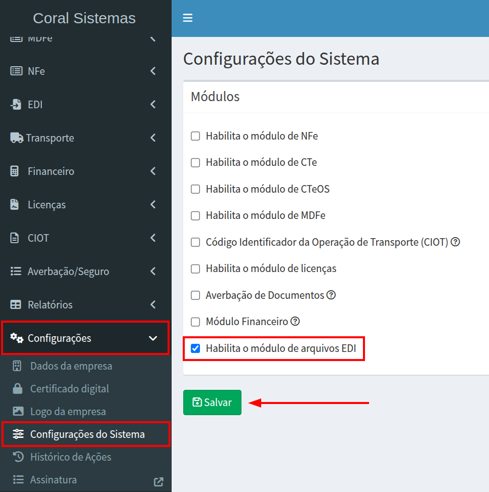 Para ativar o módulo clique no menu lateral em Configurações > Configurações do Sistema > selecione a opção "Habilita o módulo de arquivos EDI" e clique em Salvar no botão verde.