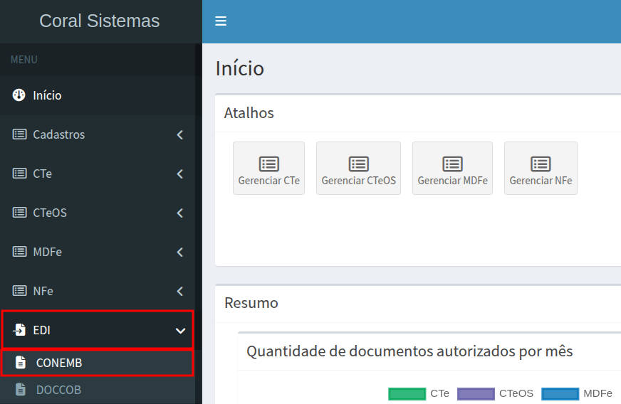 Em seguida, no menu lateral, será exibido uma guia com o nome de EDI. Clique sobre ela e verá que o CONEMB e o DOCCOB já estão na lista.