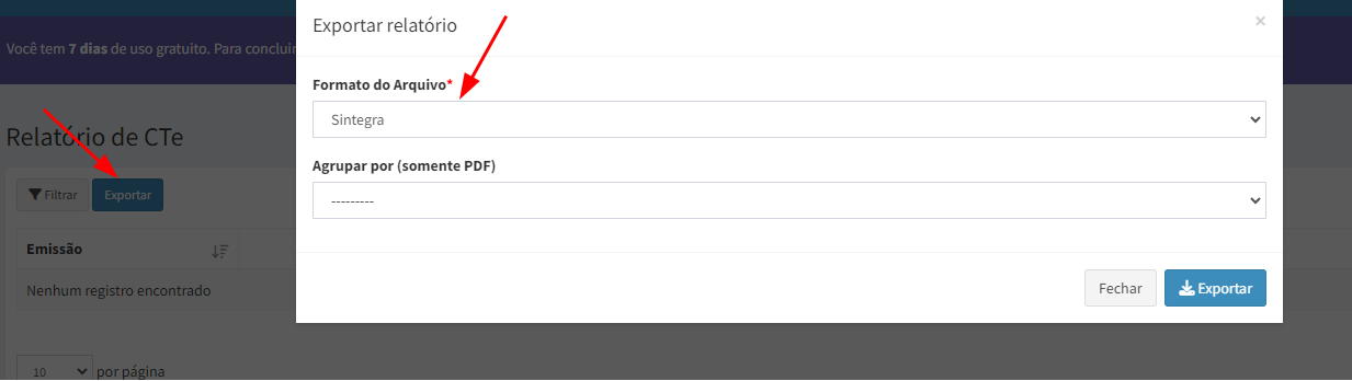 Selecionar o formato do arquivo (Sintegra) e clicar em exportar.