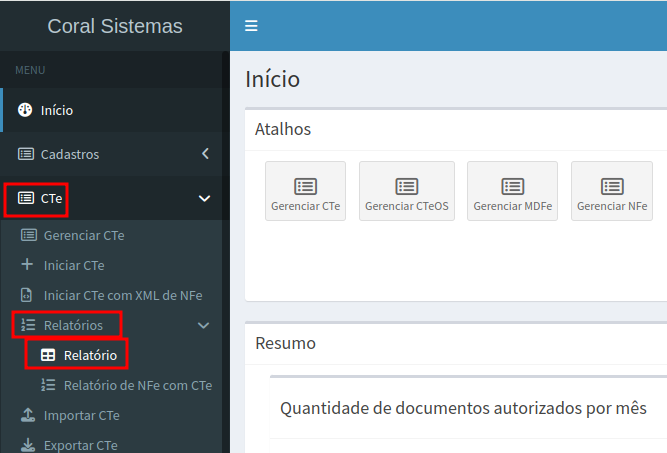 O primeiro passo é ir no menu lateral em CTe e então na opção Relatório, conforme mostra a imagem abaixo