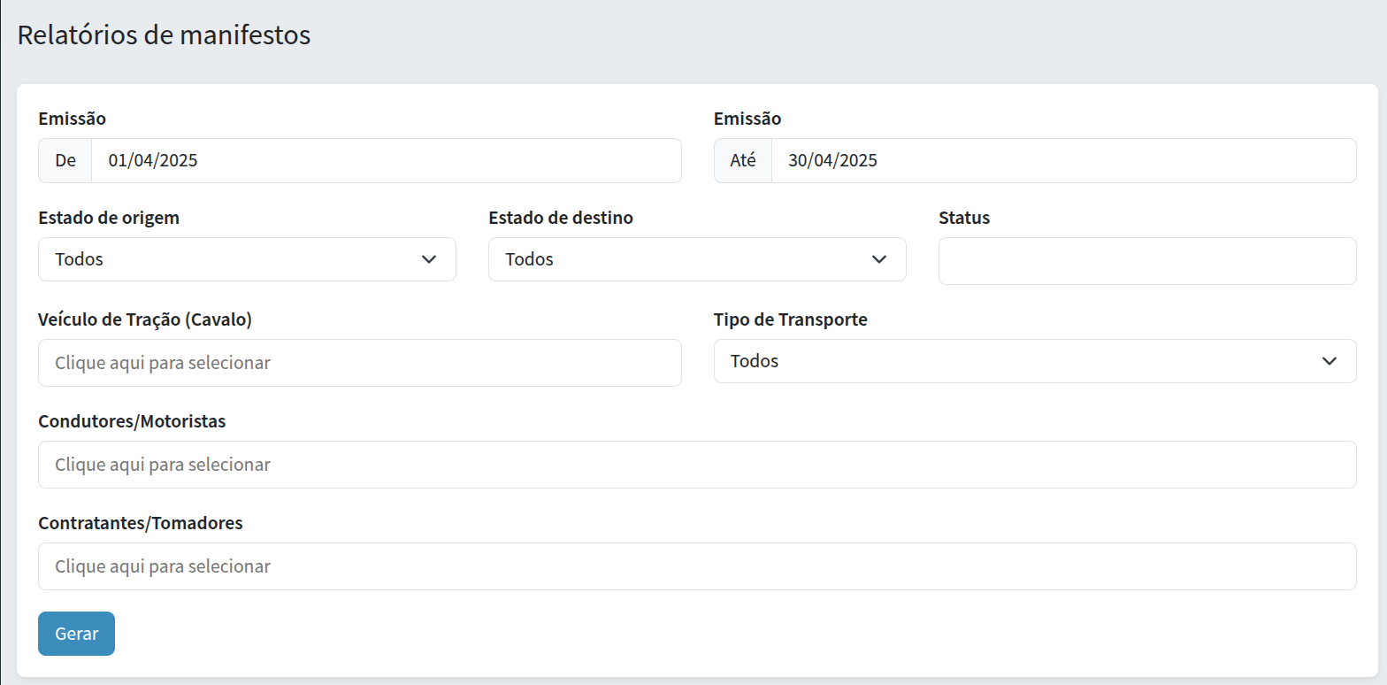 O ultimo passo é preencher os filtros do relatório de acordo com as necessidades, caso queira todos os MDFe, pode deixar em branco a maioria dos campos e preencher apenas o período a ser filtrado, como mostra o exemplo abaixo
