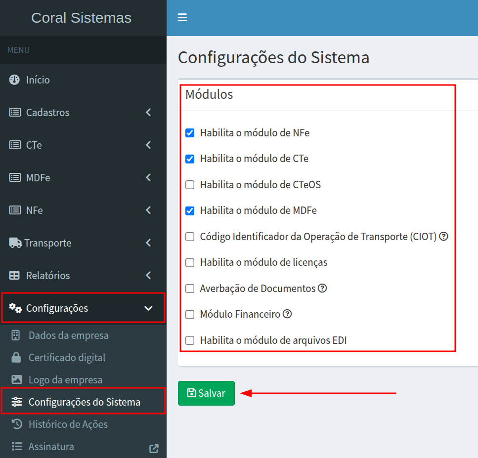 Após marcar a opção, clique em Salvar no botão verde.