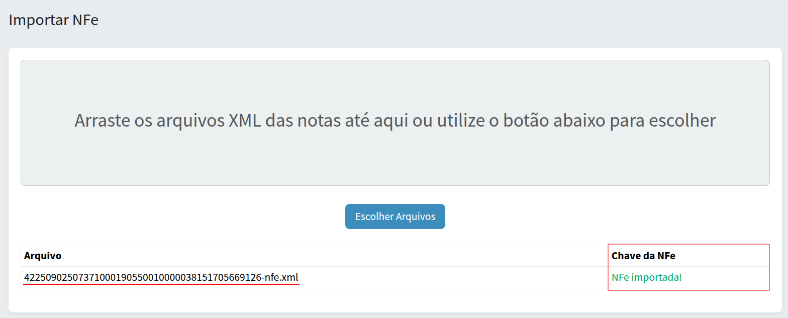 4. Depois de clicar em Abrir, o sistema vai tentar importar. Caso tenha ocorrido algum erro vai aparecer uma mensagem ao lado indicando o motivo.