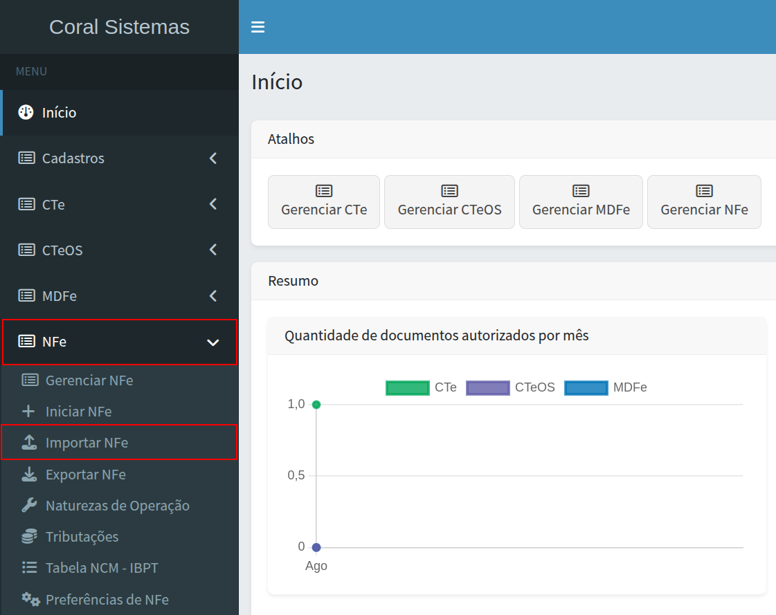 1. No menu lateral, clique em NFe e então em Importar NFe, conforme mostrado abaixo.