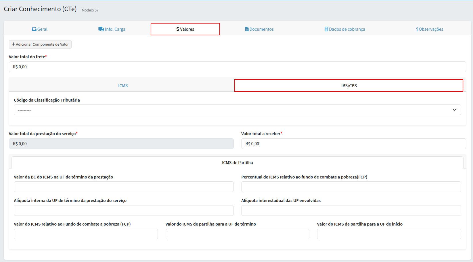Após isso, clique na aba Valores e em seguida na aba IBS/CBS