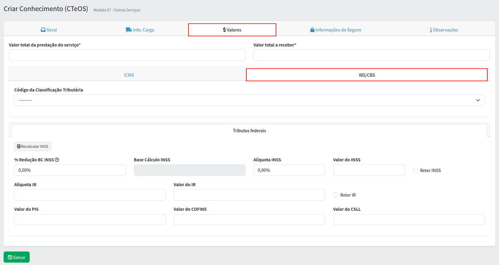 Após isso, clique na aba Valores e em seguida na aba IBS/CBS