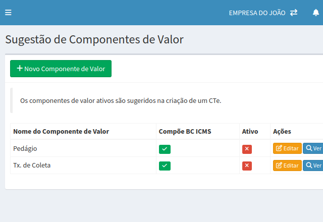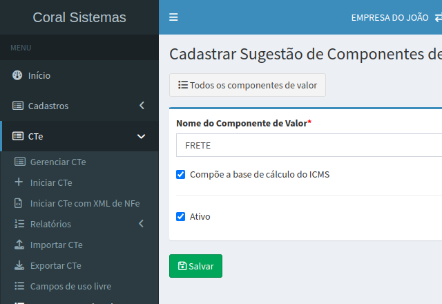 No sistema é possível configurar os componentes de valores para facilitar e tornar mais prático e rápido a emissão de CTes. Isso ajuda não somente a facilitar mas também a não esquecer nenhum componente que queira informar sempre.