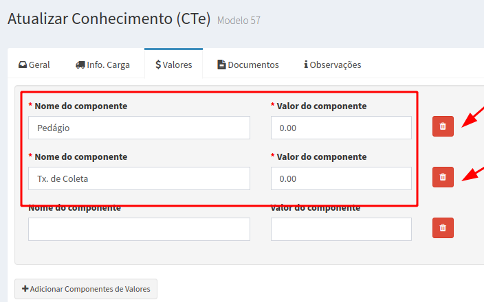 Os componentes que estiverem ativos vão ser sugeridos na hora da emissão do CTe. Lembrando que na emissão do CTe, eles ainda podem ser modificados ou excluídos antes de salvar o CTe. Veja esse exemplo na imagem abaixo que mostra a tela de emissão do CTe. Os componentes ativos já estão sendo sugeridos, e além disso, eles podem ser modificados ou excluídos (conforme apontado na imagem).