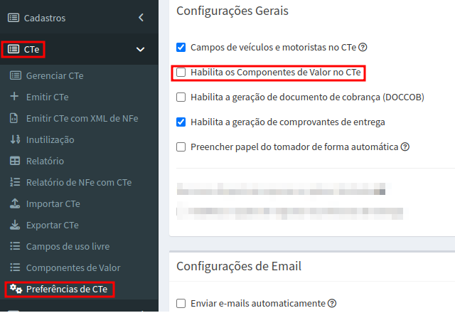 Para ativar/desativar os componentes de valor no CTe é preciso ir no menu lateral esquerdo na opção CTe e então em Preferências de CTe, marcar a opção destacada e Salvar. Conforme mostra a imagem abaixo.