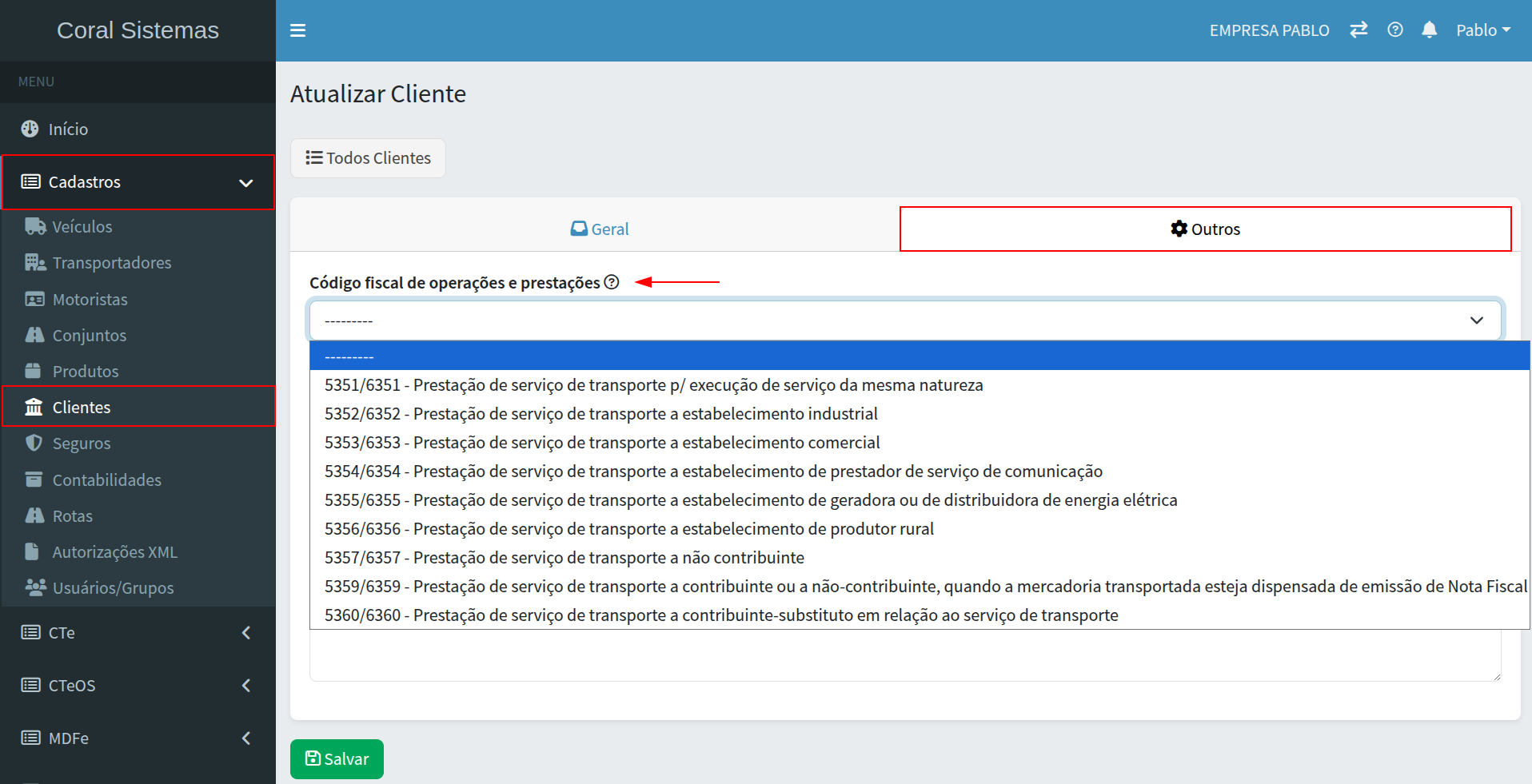 Ao gerar o CTe através do XML da NFe da mercadoria, é possível configurar o sistema para sugerir um CFOP conforme o cliente e estado de origem e destino. Veja abaixo como fazer.