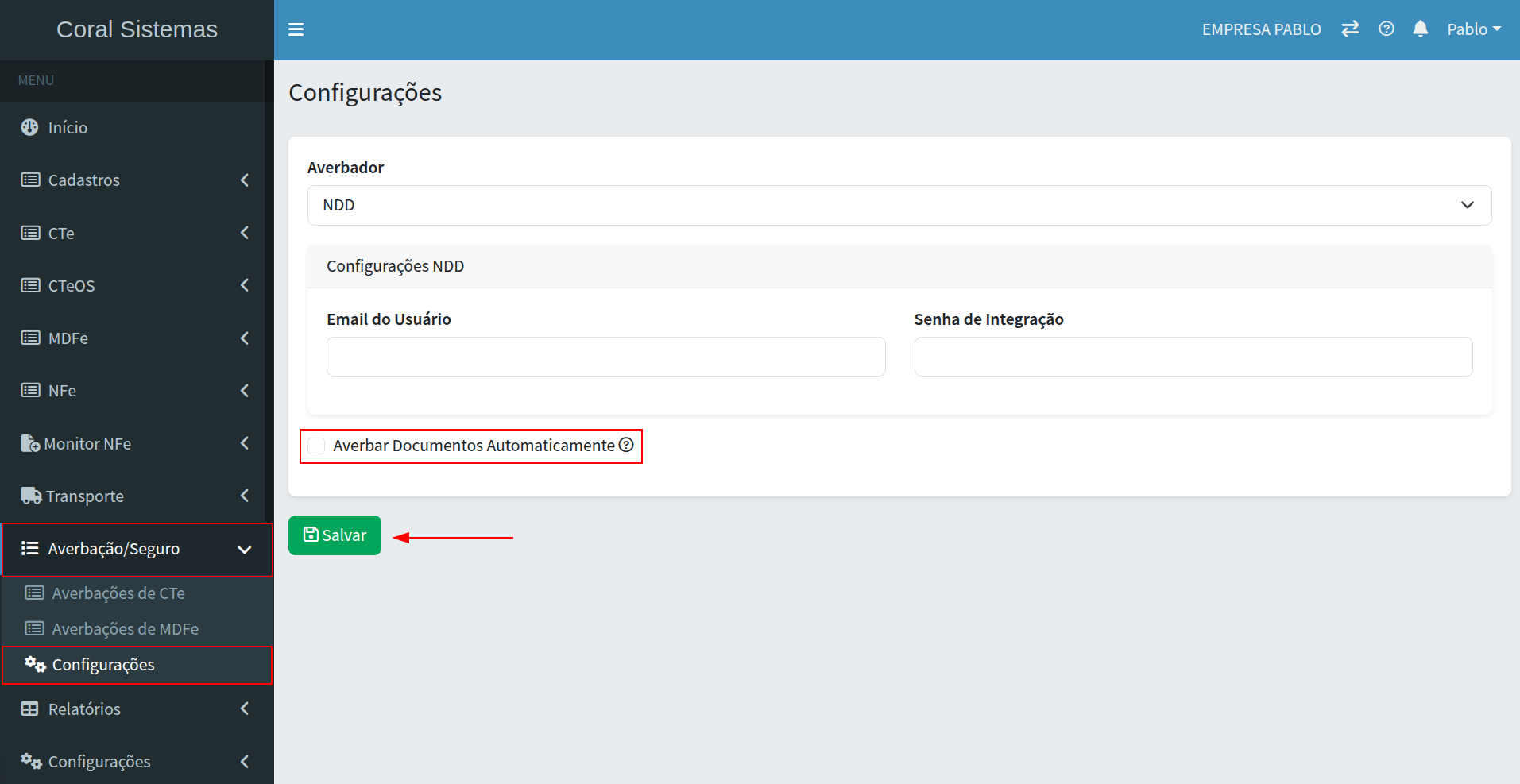 Depois de salvar a configuração, vai aparecer um novo item no menu lateral, chamado Averbação/Seguro. Dentro desse item vai ter as opções "Averbações CTe", "Averbações de MDFe" e "Configurações".