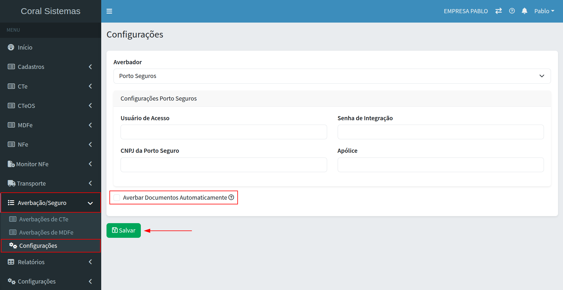 Neste passo a passo você vai aprender como configurar a integração com o sistema da Porto Seguro para fazer averbação do CTe diretamente pelo sistema.