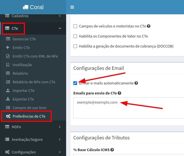 Para ativar essa opção basta entrar no menu CTe e depois em Preferências de CT. Nessa tela, selecionar a opção Enviar e-mails automaticamente e informar os endereços de e-mail que deseja enviar o CTe, e então clicar em Salvar, conforme mostra imagem abaixo.