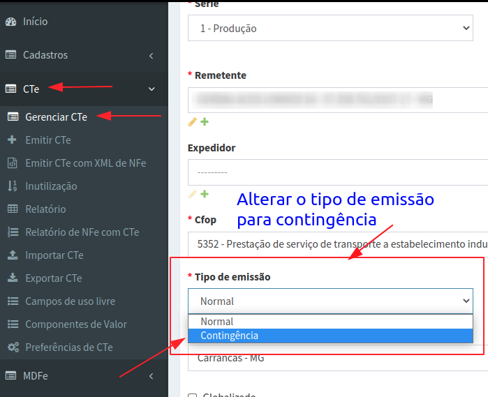 Altere o Tipo de Emissão do seu conhecimento e escolha a opção Contingência e depois salve.