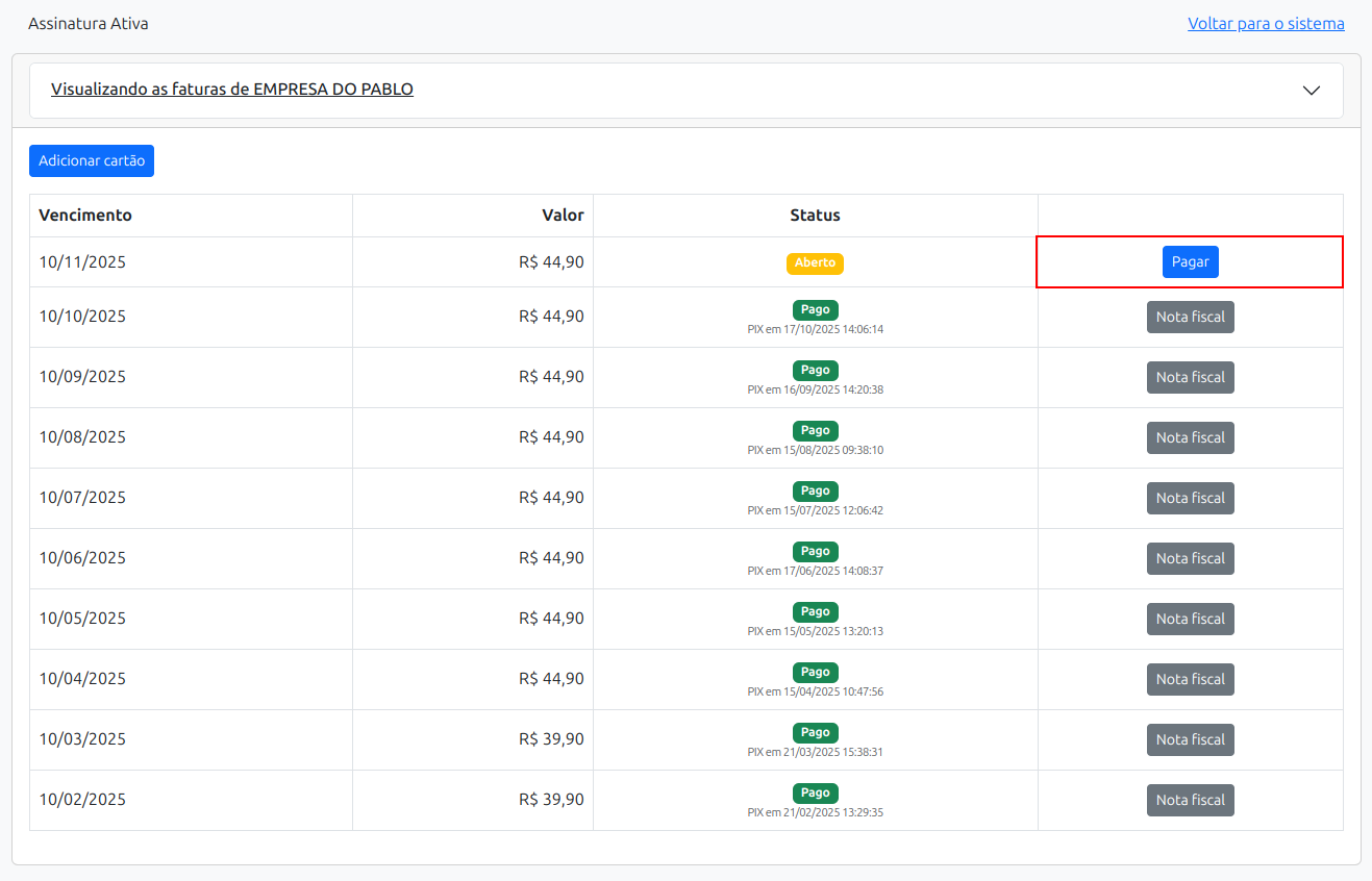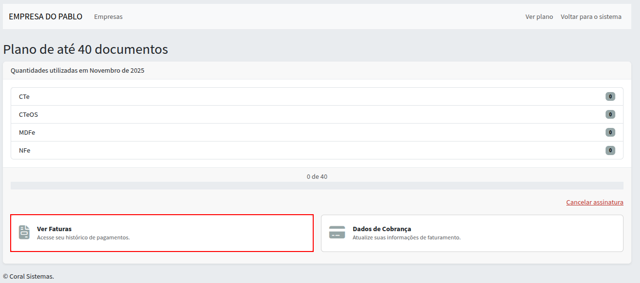 Lembrando que, apenas usuários com permissão para acessar a assinatura tem acesso a fatura do sistema.