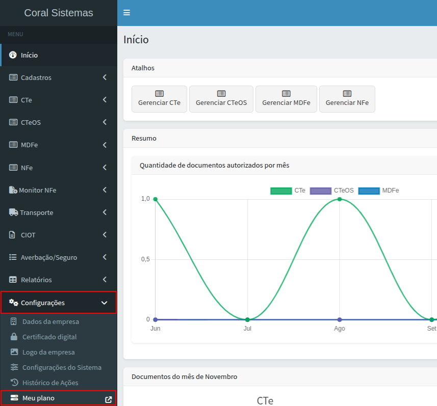 Na tela Inicial do sistema, localize o menu lateral e vá até Configurações > Meu plano