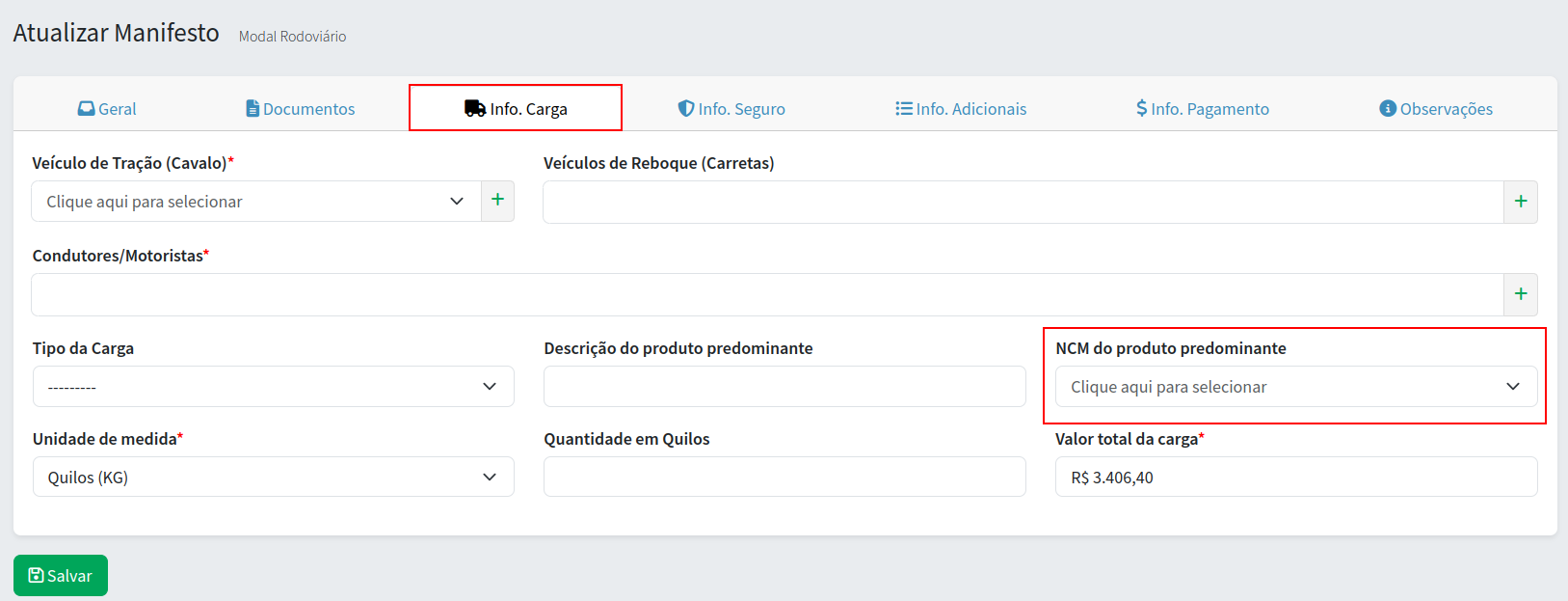 Para resoler a rejeição é preciso informar o NCM do produto predominante da carga na aba "Info. Carga", conforme mostra na imagem abaixo: