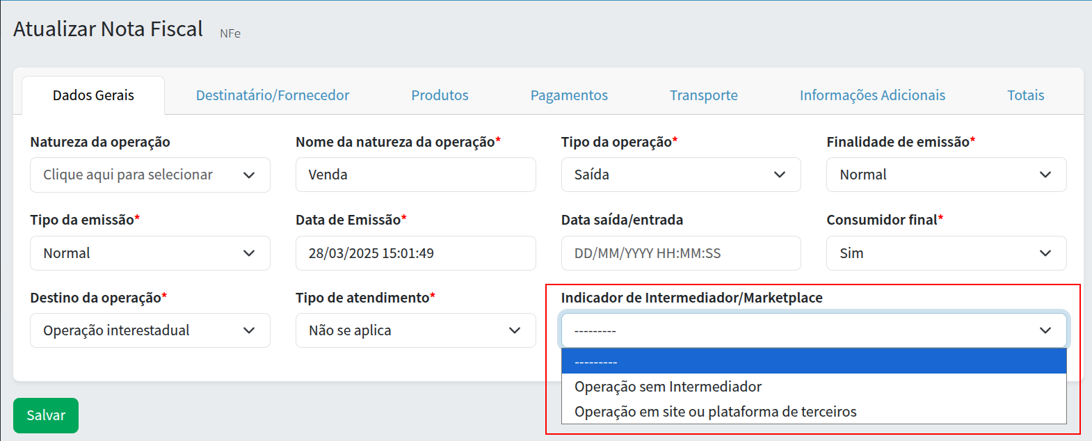 Para solucionar precisa ir até a aba Dados Gerais e selecionar alguma das opções da lista