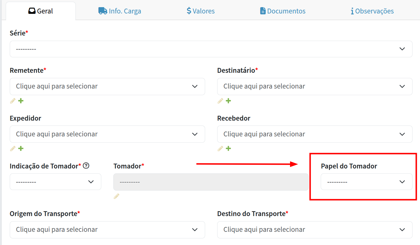 - Editar o CTe e localizar o campo “Papel do Tomador”.