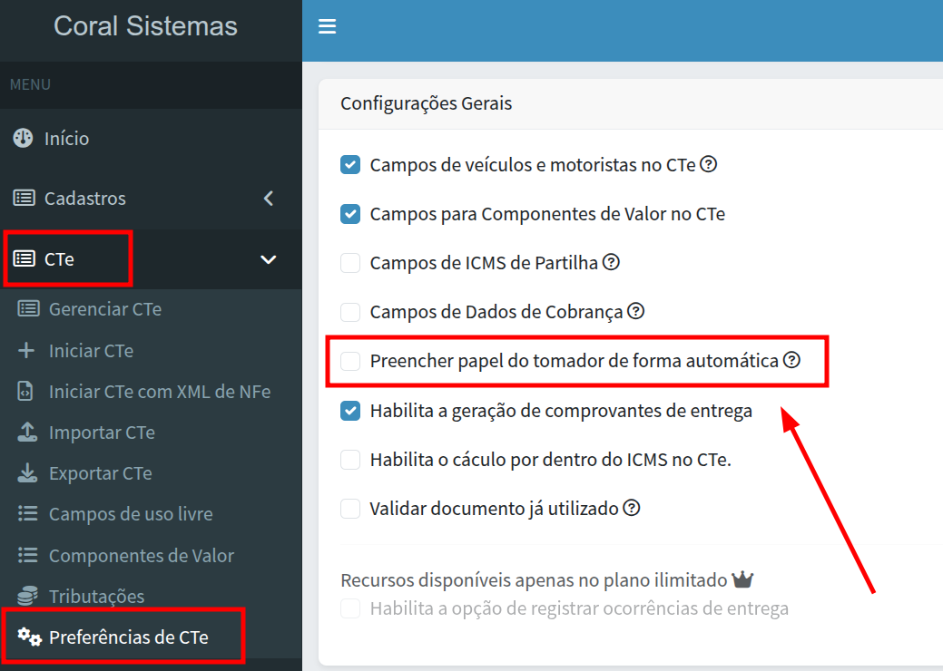 - Acesse as preferências de CTe e desative a opção Preencher papel do tomador de forma automática
